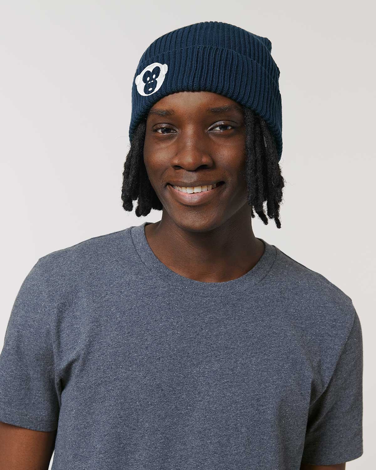 Unisex Beanie mit dem gestickten Monkey Logo, das im Dunklen leuchtet. Der weiche 1×1 Fisherman Rib wurde mit weicher Bio-Baumwolle gestrickt und passt sich durch 4 Nähte oben angenehm an die Kopfform an.