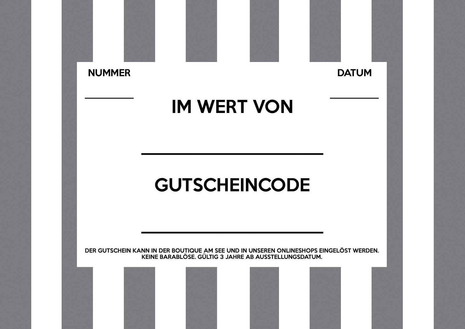 Sie bekommen ein schön bedruckte Klappkarte mit dem passenden Kuvert zugeschickt. Der Gutschein kann entweder in unserer Boutique am See oder mit dem Gutscheincode in den Onlineshops von Gina Drewes und Monkey on my shoulder eingelöst werden.